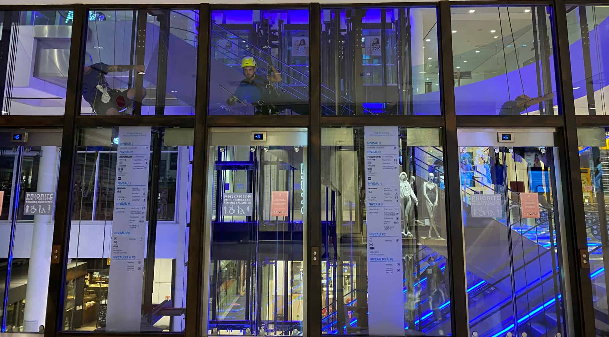Nettoyage des vitreries, Pylônes d'ascenseurs en verre ou métal